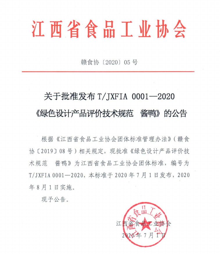 7月1日,《綠色設(shè)計(jì)產(chǎn)品評(píng)價(jià)技術(shù)規(guī)范 醬鴨》團(tuán)體標(biāo)準(zhǔn)正式發(fā)布,該標(biāo)準(zhǔn)由江西省食品工業(yè)協(xié)會(huì)牽頭,江西煌上煌集團(tuán)食品股份有限公司、南昌...