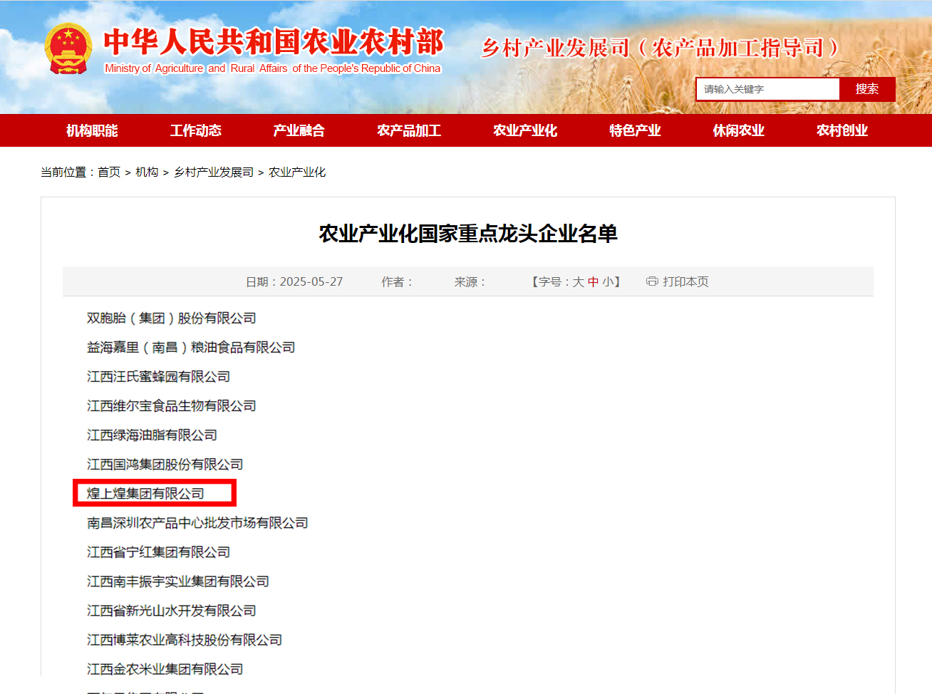 近日,農(nóng)業(yè)農(nóng)村部公布農(nóng)業(yè)產(chǎn)業(yè)化國家重點龍頭企業(yè)最新名單。其中,煌上煌集團(tuán)有限公司再次獲評“農(nóng)業(yè)產(chǎn)業(yè)化國家重點龍頭企業(yè)”,這是煌上煌...